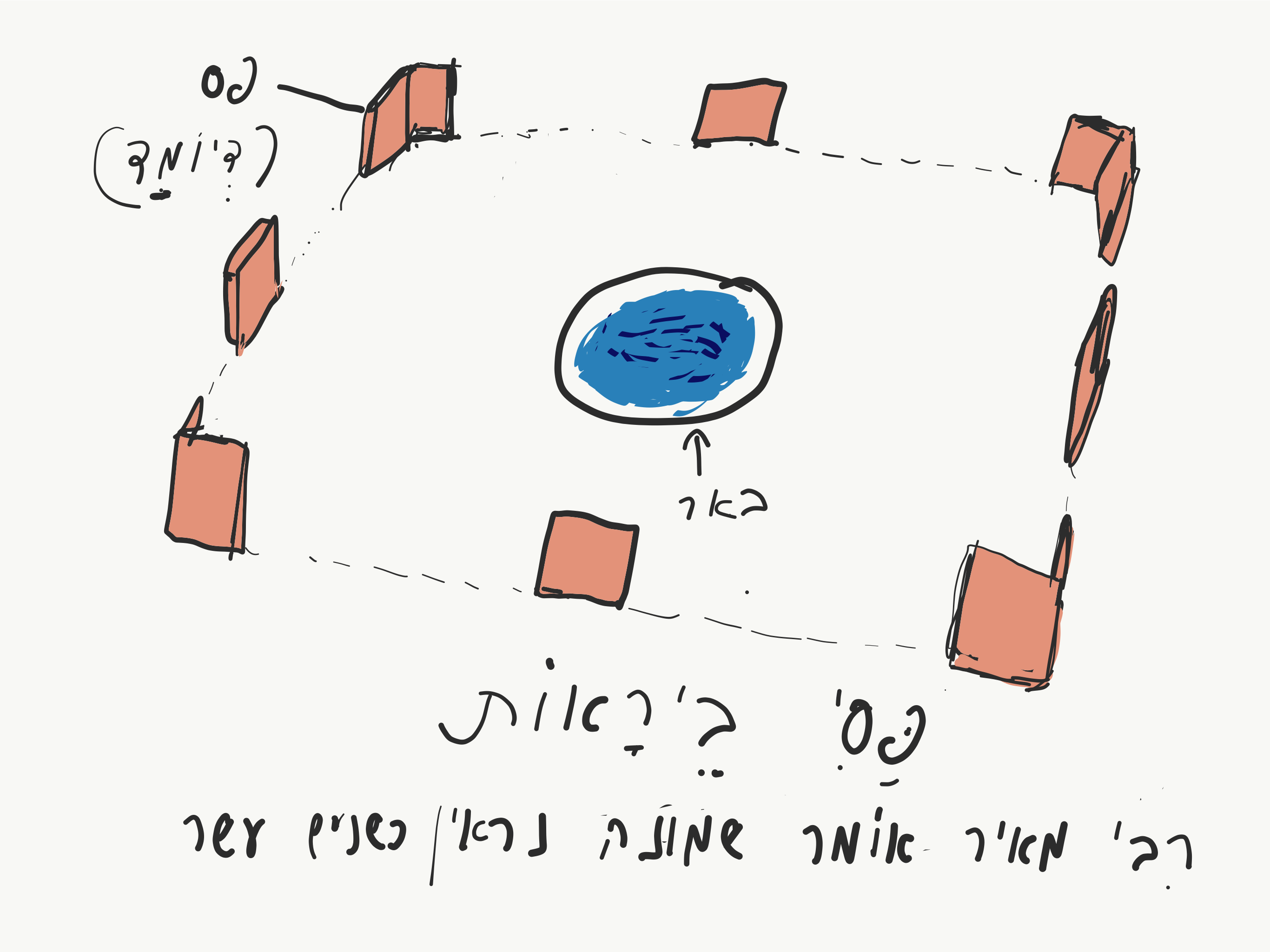 Eiruvin 1:10 https://onlinemishna.com/wp-content/uploads/2019/06/eiruvin-1_10.m4a מַקִּיפִין בְּקָנִים, וּבִלְבַד שֶׁלֹּא יְהֵא בֵין קָנֶה לַחֲבֵרוֹ שְׁלֹשָׁה טְפָחִים. בְּשַׁיָּרָא דִבְּרוּ, דִּבְרֵי רַבִּי יְהוּדָה. וַחֲכָמִים אוֹמְרִים, לֹא דִבְּרוּ בְשַׁיָּרָא אֶלָּא בַהֹוֶה. כָּל מְחִצָּה שֶׁאֵינָהּ שֶׁל שְׁתִי וְשֶׁל עֵרֶב, אֵינָהּ מְחִצָּה, דִּבְרֵי רַבִּי יוֹסֵי בַּר רַבִּי יְהוּדָה. וַחֲכָמִים אוֹמְרִים, אֶחָד מִשְּׁנֵי דְבָרִים. אַרְבָּעָה דְבָרִים פָּטְרוּ בַמַּחֲנֶה, מְבִיאִין עֵצִים מִכָּל מָקוֹם, וּפְטוּרִים מֵרְחִיצַת יָדַיִם, וּמִדְּמַאי, וּמִלְּעָרֵב Eiruvin 2:1 https://onlinemishna.com/wp-content/uploads/2019/06/eiruvin-2_1-pic.m4a עוֹשִׂין פַּסִּין לַבֵּירָאוֹת אַרְבָּעָה דְיוּמְדִין, נִרְאִין כִּשְׁמֹנָה, דִּבְרֵי רַבִּי יְהוּדָה. רַבִּי מֵאִיר אוֹמֵר, שְׁמֹנָה, נִרְאִין כִּשְׁנֵים עָשָׂר, אַרְבָּעָה דְיוּמְדִין וְאַרְבָּעָה פְשׁוּטִין. גָּבְהָן עֲשָׂרָה טְפָחִים, וְרָחְבָּן שִׁשָּׁה, וְעָבְיָן כָּל שֶׁהוּא, וּבֵינֵיהֶן כִּמְלֹא שְׁתֵּי רְבָקוֹת שֶׁל שָׁלֹשׁ שָׁלֹשׁ בָּקָר, דִּבְרֵי רַבִּי מֵאִיר. רַבִּי יְהוּדָה אוֹמֵר, שֶׁל אַרְבַּע אַרְבַּע, קְשׁוּרוֹת וְלֹא מֻתָּרוֹת, אַחַת נִכְנֶסֶת וְאַחַת יוֹצֵאת