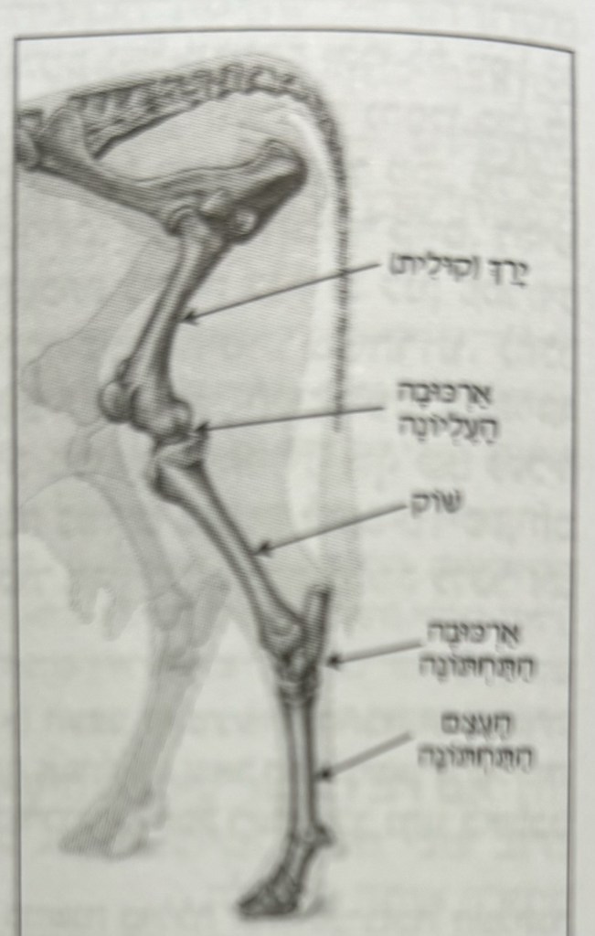 בְּהֵמָה שֶׁנֶּחְתְּכוּ רַגְלֶיהָ מִן הָאַרְכֻּבָּה וּלְמַטָּה, כְּשֵׁרָה. מִן הָאַרְכֻּבָּה וּלְמַעְלָה, פְּסוּלָה. וְכֵן שֶׁנִּטַּל צֹמֶת הַגִּידִין. נִשְׁבַּר הָעֶצֶם, אִם רֹב הַבָּשָׂר קַיָּם, שְׁחִיטָתוֹ מְטַהַרְתּוֹ. וְאִם לָאו, אֵין שְׁחִיטָתוֹ מְטַהַרְתּוֹ