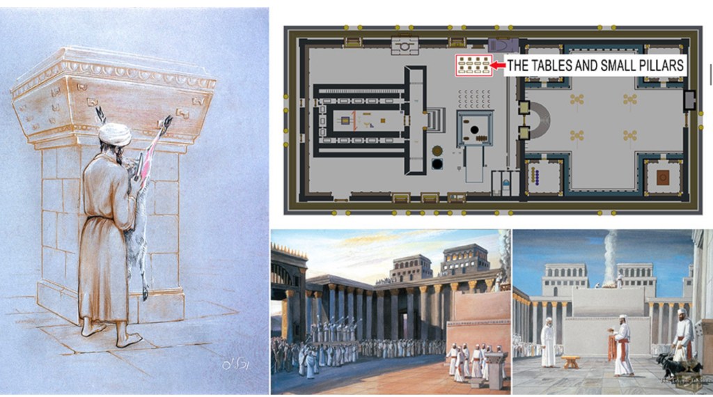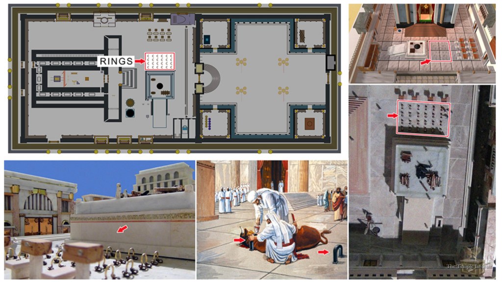לֹא הָיוּ כוֹפְתִין אֶת הַטָּלֶה, אֶלָּא מְעַקְּדִין אוֹתוֹ. מִי שֶׁזָּכוּ בָאֵבָרִים, אוֹחֲזִים בּוֹ. וְכָךְ הָיְתָה עֲקֵדָתוֹ, רֹאשׁוֹ לַדָּרוֹם וּפָנָיו לַמַּעֲרָב. הַשּׁוֹחֵט, עוֹמֵד בַּמִּזְרָח וּפָנָיו לַמַּעֲרָב. שֶׁל שַׁחַר הָיָה נִשְׁחָט עַל קֶרֶן צְפוֹנִית מַעֲרָבִית, עַל טַבַּעַת שְׁנִיָּה. שֶׁל בֵּין הָעַרְבַּיִם הָיָה נִשְׁחָט עַל קֶרֶן מִזְרָחִית צְפוֹנִית, עַל טַבַּעַת שְׁנִיָּה. שָׁחַט הַשּׁוֹחֵט, וְקִבֵּל הַמְקַבֵּל. בָּא לוֹ לְקֶרֶן מִזְרָחִית צְפוֹנִית, וְנוֹתֵן מִזְרָחָה צָפוֹנָה. מַעֲרָבִית דְּרוֹמִית, וְנוֹתֵן מַעֲרָבָה דָרוֹמָה. שְׁיָרֵי הַדָּם הָיָה שׁוֹפֵךְ עַל יְסוֹד דְּרוֹמִית