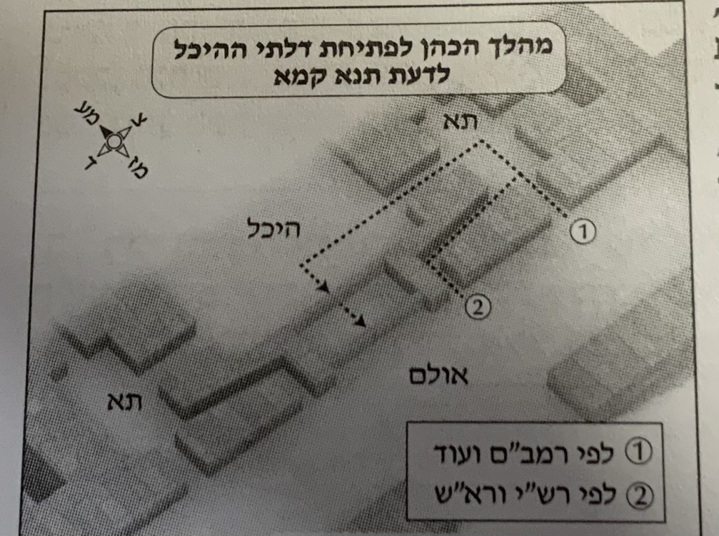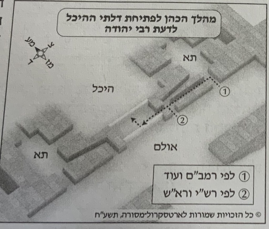 וּשְׁנֵי פִשְׁפָּשִׁין הָיוּ לוֹ לַשַּׁעַר הַגָּדוֹל, אֶחָד בַּצָּפוֹן, וְאֶחָד בַּדָּרוֹם. שֶׁבַּדָּרוֹם, לֹא נִכְנַס בּוֹ אָדָם מֵעוֹלָם, וְעָלָיו הוּא מְפֹרָשׁ עַל יְדֵי יְחֶזְקֵאל, שֶׁנֶּאֱמַר (שם מד), וַיֹּאמֶר אֵלַי ה’ הַשַּׁעַר הַזֶּה סָגוּר יִהְיֶה לֹא יִפָּתֵחַ וְאִישׁ לֹא יָבֹא בוֹ כִּי ה’ אֱלֹהֵי יִשְׂרָאֵל בָּא בוֹ וְהָיָה סָגוּר. נָטַל אֶת הַמַּפְתֵּחַ וּפָתַח אֶת הַפִּשְׁפָּשׁ, וְנִכְנַס לְהַתָּא, וּמֵהַתָּא לַהֵיכָל. רַבִּי יְהוּדָה אוֹמֵר, בְּתוֹךְ עָבְיוֹ שֶׁל כֹּתֶל הָיָה מְהַלֵּךְ, עַד שֶׁנִּמְצָא עוֹמֵד בֵּין שְׁנֵי הַשְּׁעָרִים, וּפָתַח אֶת הַחִיצוֹנוֹת מִבִּפְנִים וְאֶת הַפְּנִימִיּוֹת מִבַּחוּץ