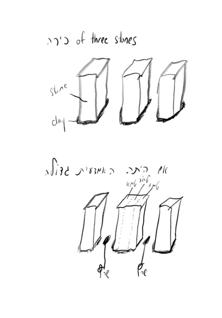 שָׁלֹשׁ אֲבָנִים שֶׁעֲשָׂאָן שְׁתֵּי כִירַיִם, נִטְמֵאת אַחַת מִן הַחִיצוֹנָה, הָאֶמְצָעִית הַמְשַׁמֶּשֶׁת אֶת הַטְּמֵאָה, טְמֵאָה. הַמְשַׁמֶּשֶׁת הַטְּהוֹרָה, טְהוֹרָה. נִטְּלָה הַטְּהוֹרָה, הֻחְלְטָה הָאֶמְצָעִית לְטֻמְאָה. נִטְּלָה הַטְּמֵאָה, הֻחְלְטָה הָאֶמְצָעִית לִטְהוֹרָה. נִטְמְאוּ שְׁתַּיִם הַחִיצוֹנוֹת, אִם הָיְתָה הָאֶמְצָעִית גְּדוֹלָה, נוֹתֵן לָזוֹ כְדֵי שְׁפִיתָה מִכָּאן וְלָזוֹ כְדֵי שְׁפִיתָה מִכָּאן, וְהַשְּׁאָר טָהוֹר. וְאִם הָיְתָה קְטַנָּה, הַכֹּל טָמֵא. נִטְּלָה הָאֶמְצָעִית, אִם יָכוֹל לִשְׁפֹּת עָלֶיהָ יוֹרָה גְדוֹלָה, טְמֵאָה. הֶחֱזִירָהּ, טְהוֹרָה. מֵרְחָהּ בְּטִיט, מְקַבֶּלֶת טֻמְאָה מִשֶּׁיַּסִּיקֶנָּה כְּדֵי לְבַשֵּׁל עָלֶיהָ אֶת הַבֵּיצָה
