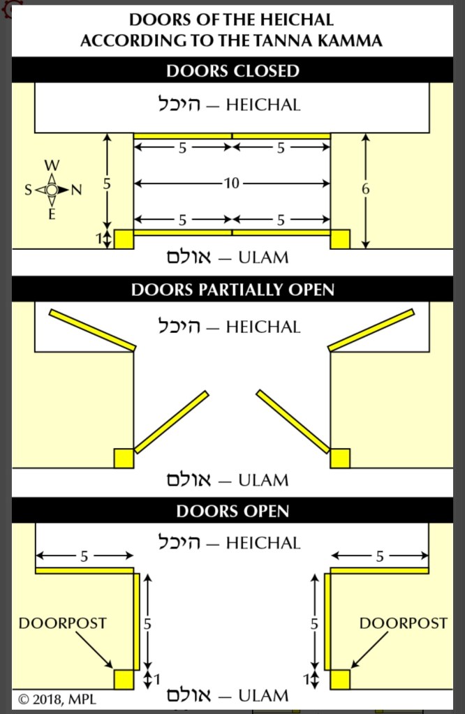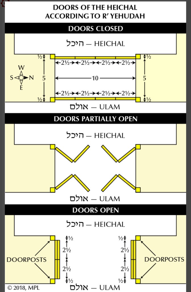 פִּתְחוֹ שֶׁל הֵיכָל, גָּבְהוֹ עֶשְׂרִים אַמָּה וְרָחְבּוֹ עֶשֶׂר אַמּוֹת. וְאַרְבַּע דְּלָתוֹת הָיוּ לוֹ, שְׁתַּיִם בִּפְנִים וּשְׁתַּיִם בַּחוּץ, שֶׁנֶאֱמַר (יחזקאל מא), וּשְׁתַּיִם דְּלָתוֹת לַהֵיכָל וְלַקֹּדֶשׁ. הַחִיצוֹנוֹת נִפְתָּחוֹת לְתוֹךְ הַפֶּתַח לְכַסּוֹת עָבְיוֹ שֶׁל כֹּתֶל, וְהַפְּנִימִיּוֹת נִפְתָּחוֹת לְתוֹךְ הַבַּיִת לְכַסּוֹת אַחַר הַדְּלָתוֹת, שֶׁכָּל הַבַּיִת טוּחַ בְּזָהָב, חוּץ מֵאַחַר הַדְּלָתוֹת. רַבִּי יְהוּדָה אוֹמֵר, בְּתוֹךְ הַפֶּתַח הָיוּ עוֹמְדוֹת, וּכְמִין אִצְטְרָמִיטָה הָיוּ, וְנִקְפָּלוֹת לַאֲחוֹרֵיהֶן, אֵלּוּ שְׁתֵּי אַמּוֹת וּמֶחֱצָה, וְאֵלּוּ שְׁתֵּי אַמּוֹת וּמֶחֱצָה, חֲצִי אַמָּה מְזוּזָה מִכָּאן, וַחֲצִי אַמָּה מְזוּזָה מִכָּאן, שֶׁנֶּאֱמַר (שם), וּשְׁתַּיִם דְּלָתוֹת לַדְּלָתוֹת שְׁתַּיִם מוּסַבּוֹת דְּלָתוֹת, שְׁתַּיִם לְדֶלֶת אֶחָת וּשְׁתֵּי דְלָתוֹת לָאַחֶרֶת